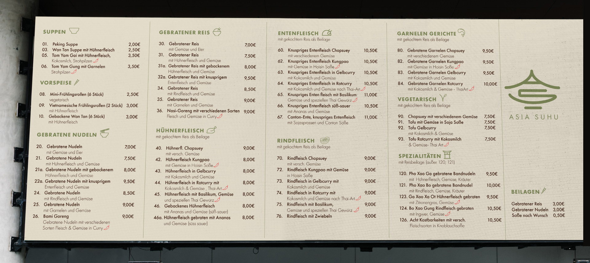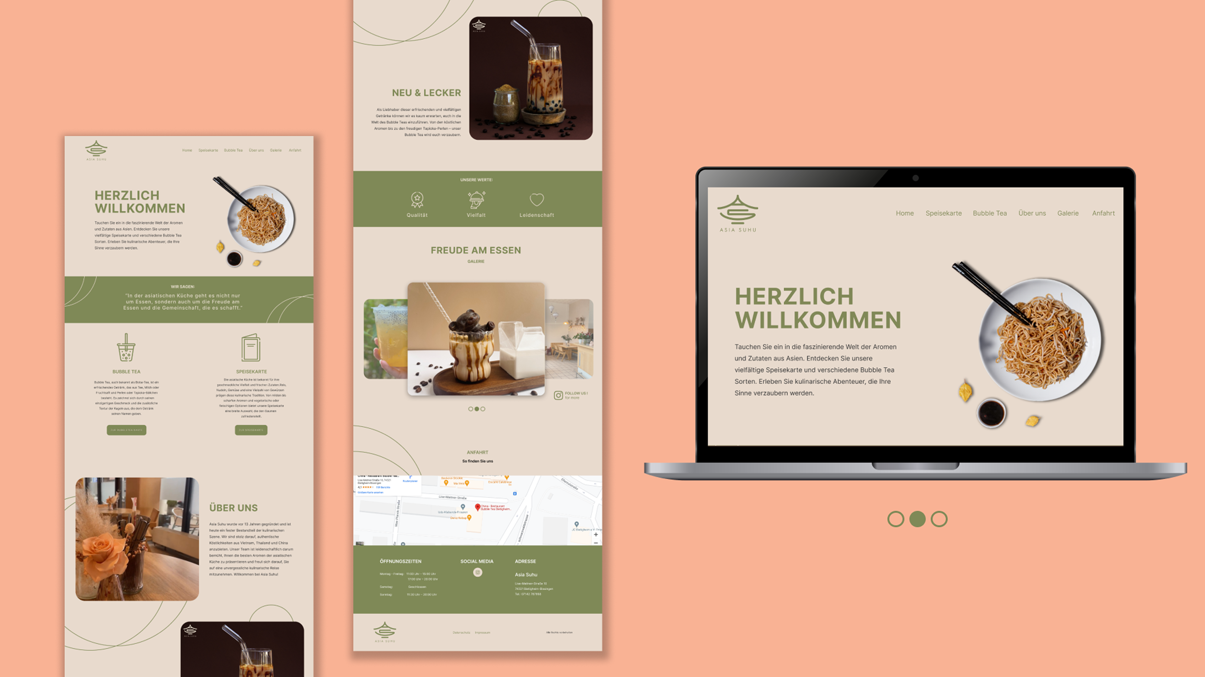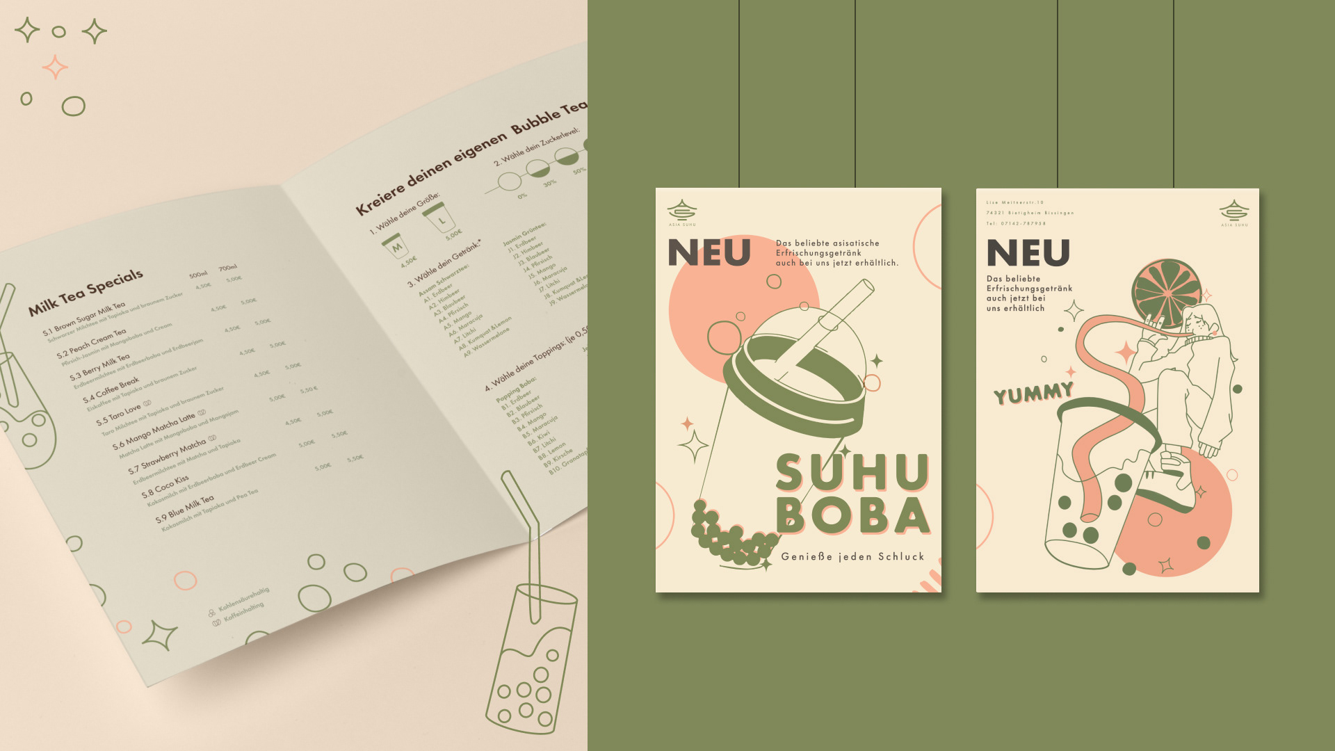 Asia Suhu ist ein Restaurant im Zentrum von Bietigheim-Bissingen. Im Zuge eines Inhaberwechsels und der Erweiterung des Angebots wurde das bestehende Corporate Design überarbeitet. Ziel war es, eine visuelle Identität zu entwickeln, die eine jüngere Zielgruppe anspricht und gleichzeitig eine ruhige, moderne Atmosphäre vermittelt. Neben der Überarbeitung des Erscheinungsbilds gestaltete ich auch den neuen Webauftritt sowie die Social Media Präsenz, um das Design konsistent auf digitale Medien zu übertragen und die Online-Präsenz des Restaurants zu stärken.